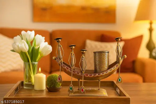 Sail into culture with this handcrafted Kerala boat showpiece – complete with traditional paddlers and a built-in metal pen stand. A unique piece of ethnic desk decor, this golden-tone boat blends traditional artistry with daily utility.