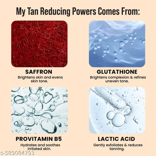 I am the Solution you need! I work My magic on Tan and help you unveil your Hidden glow. With My Trusty allies like Sandalwood, Saffron & Glutathione i make your skin brighter & More Radiant